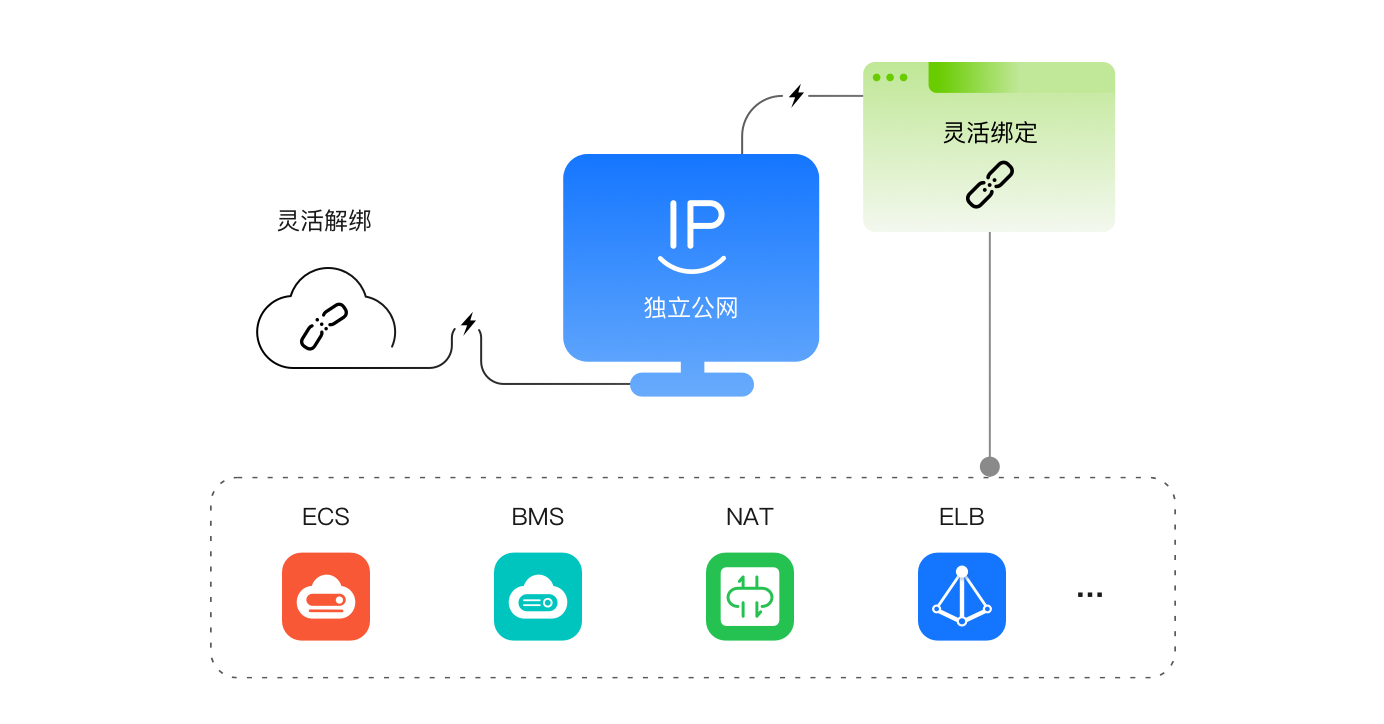 弹性的资源关联,与弹性云服务器 ECS、裸金属服务器 BMS、NAT网关、弹性负载均衡 ELB、虚拟IP等资源灵活绑定与解绑